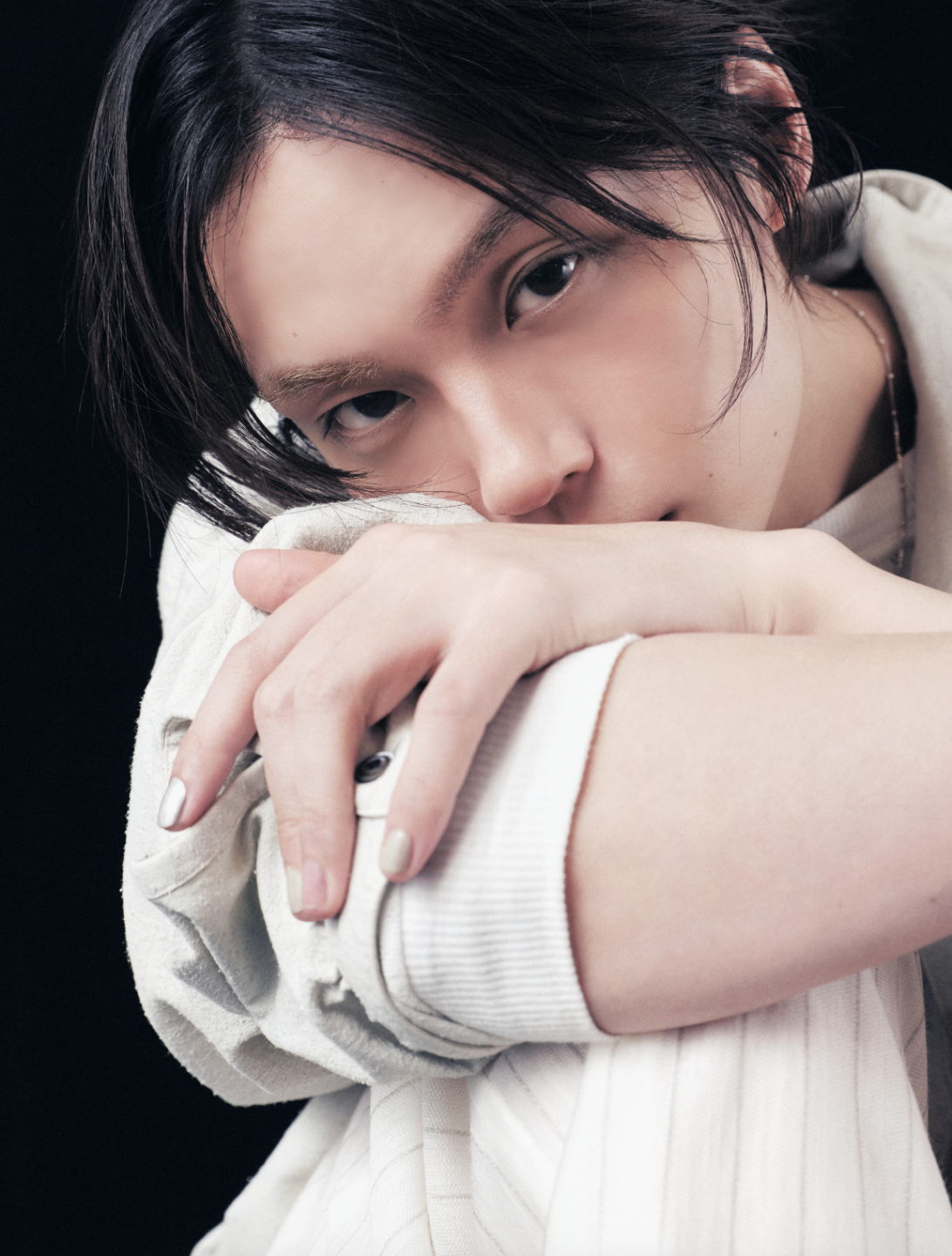 あえてポイントを“作らない”潔さで抜け感のある整った印象に。ブラーマットな口元で繊細な色気を添えて。